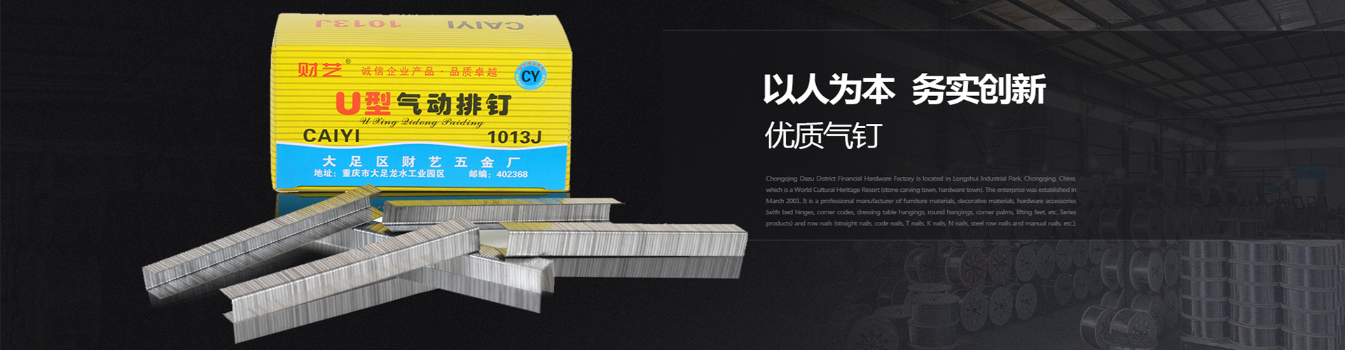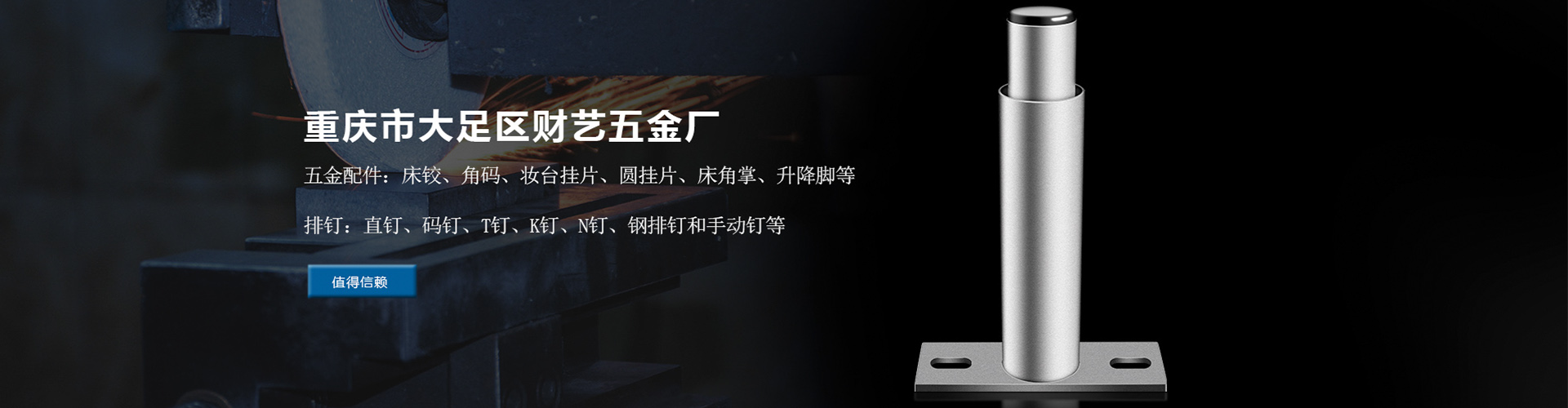 重庆市大足区财艺五金厂,是一家专业生产家具材料、装饰材料、五金配件(有床铰、角码、妆台挂片、圆挂片、床角掌、升降脚等系列产品)和排钉(有直钉、码钉、T钉、K钉、N钉、钢排钉和手动钉)等的生产及销售企业。